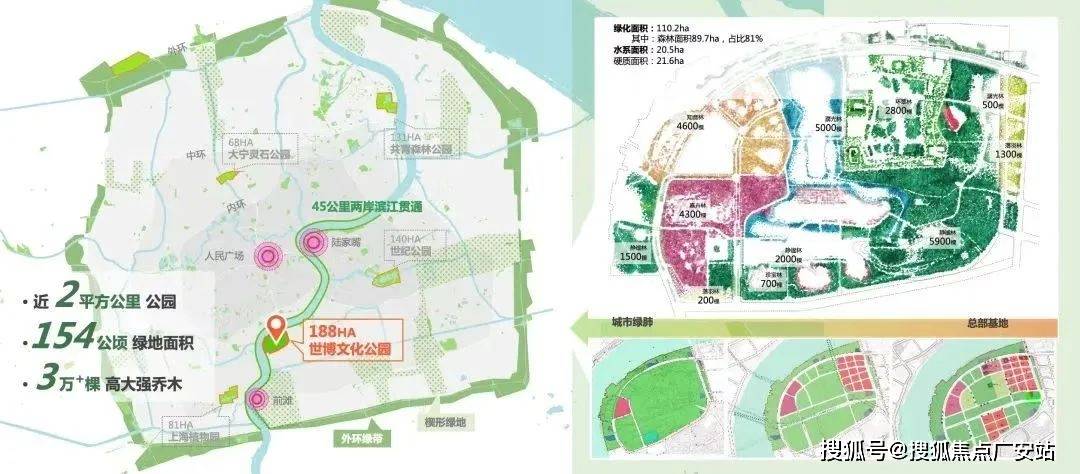 休闲方面:『世界都心休闲——未来全球最大的中央公园』约200万方世博文化公园+前滩百万方公园群+三林绿地,共构成约700万方滨江公园,成就滨江双S湾最大的百万方公园群。
