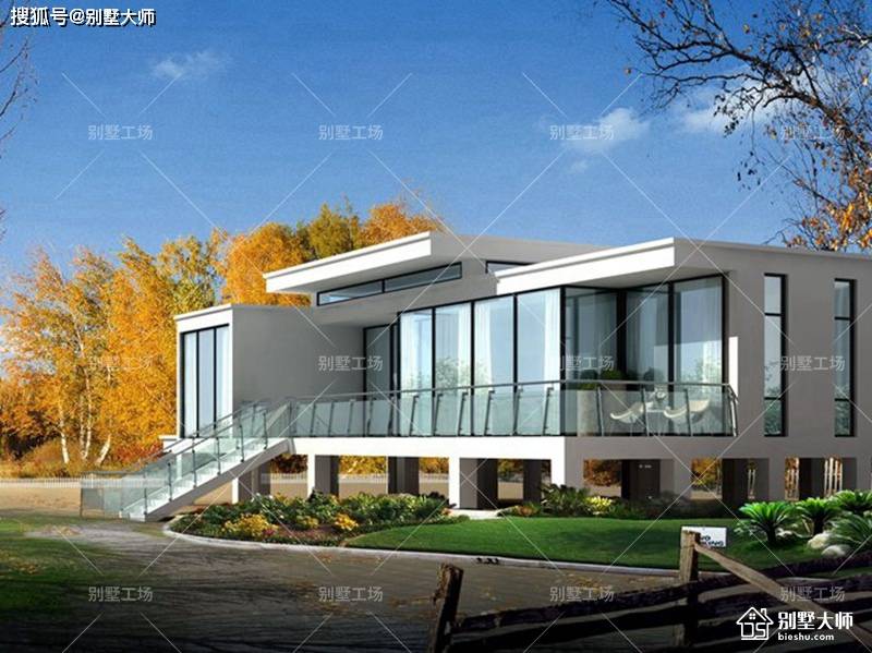 这款别墅是现代化风格的设计,简单的白墙,平顶的屋面,大面积的玻璃墙面,几个方块造型的组合,简约时尚,底部架空的设计更是避免了潮湿的通病。