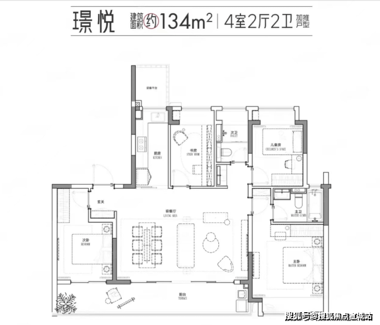 户型设计:约 134㎡户型南向约 13.3m 面宽,约 9m 全景阳台;约 168㎡户型南向面宽约 13.6m,约 9.8m 阳台;约 198㎡户型 3+1 开间朝南,南北 270° 环景飘窗;约 243㎡户型 3+1 开间朝南,约 6m 宽厅,南北飘窗。