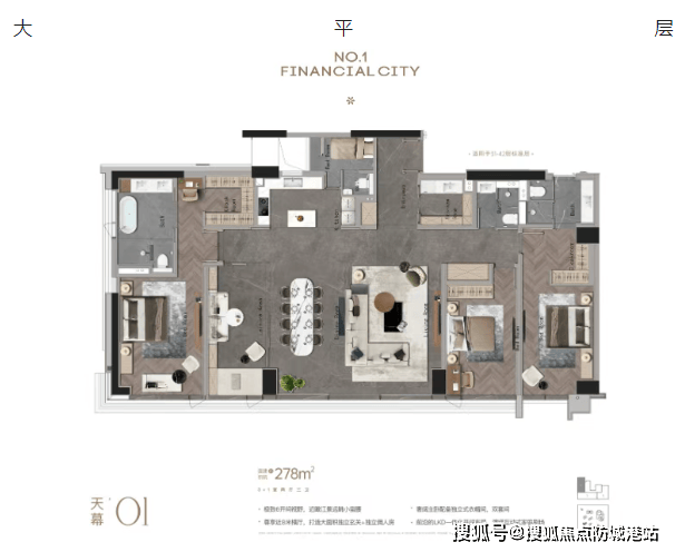 :罕见于金融城板块的高奢大户型,双面采光,270°环幕视野,可打造成私人会客厅或顶层艺术居所,满足高净值人群对身份感与生活仪式感的需求。