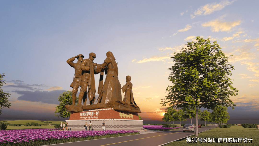 26红军过草地第一村标识设计项目位于若尔盖巴西镇班佑村,这里曾经是中国工农红军进入草地以来的第一个有人烟的村寨,“红军过草地第一村”因此得名。读道文旅团队经过对班佑村的实地踏勘以及对红色文化的领悟,将班佑草地、巴西会议会址、包座战役旧址等革命遗址和《七根火柴》、《金色的鱼钩》等可歌可泣的红军故事加以融合提炼,进行了红军过草地第一村——班佑村的入口门户形象标识设计。结合历史文化及红色文化,创意设计由牧民向红军献哈达为主要元素的景观雕塑,表达牧民与红军一家亲的深层含义,通过一组雕塑,铭记一段历史。