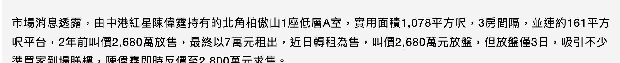 到了2024年底,他直接把价砍到2680万——比当年买入只多了30万。这回不是试探,是真想脱手。有报道说挂牌三天就有好几组人来看房,他立马加回2800万。不是赌气,是发现市场真有点回暖了:北角租金回到疫情前水平,差饷处数据也显示一季度成交涨了两成。