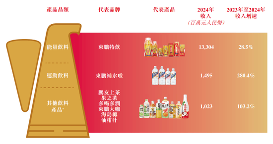 于是,公司开始拓展“第二增长曲线年起,公司推出了多款新产品,包括电解质饮料“东鹏补水啦”、咖啡风味饮料“东鹏大咖”、酒精饮料“VIVI鸡尾酒”、以及茶饮料“鹏友上茶”等。