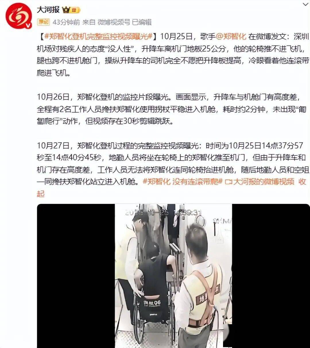 10月25日下午,歌手郑智化在微博发文,称深圳机场对残疾人的态度没人性,升降车离机门地板25公分,他的轮椅推不进飞机,腿也跨不进机舱门,操纵升降车的司机完全不愿把升降板提高,冷眼看着他连滚带爬进飞机。