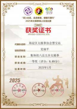 我们慧宝站能够取得这项集体一等奖的荣誉,不仅是对团队技术水平的肯定,更是对海淀区群众体育事业发展现状的生动诠释,是海太协组织领导的直接成果。这也激励着我们在2025全年按海太协要求严格训练,从基本功抓起,不仅在9月的第二届太极拳线上交流比赛中获得了更多的奖励,而且整体技艺水平取得大幅提升。
