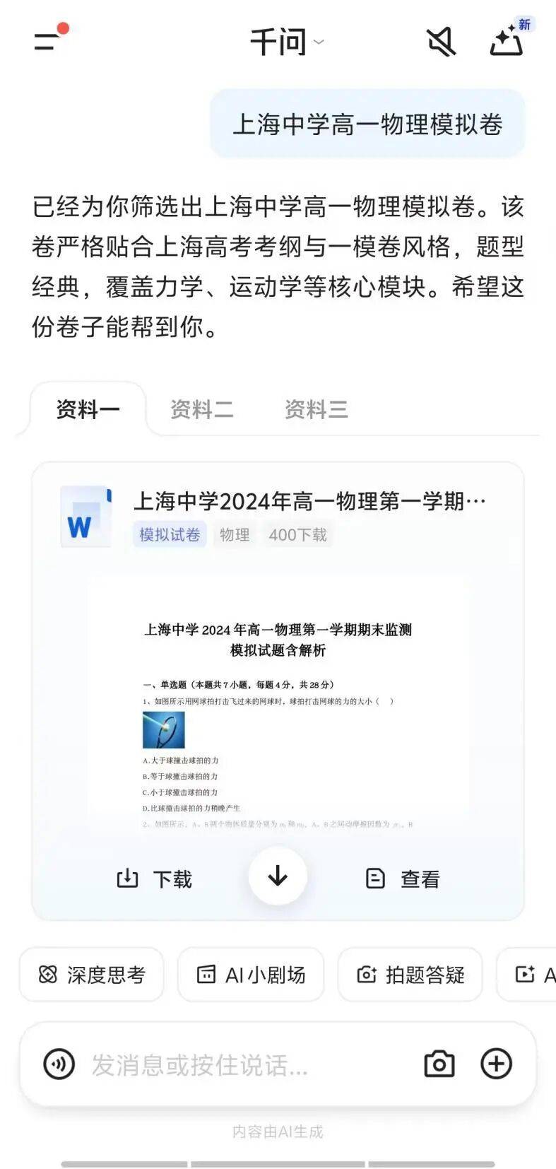 极目新闻记者实测发现,找卷子操作简单到令人惊喜:只需“一句话”下达指令,就能精准获取所需资料。例如,搜索“上海中学高一物理模拟卷”,千问能迅速给到PDF和Word版本,并支持一键下载打印。其题库覆盖广,不仅有全国重点中学期末卷、中高考模拟卷,还包含浙江、广东等省份本地化特色试卷,甚至能精准匹配指定小学三年级英语单元测试卷这类细分需求。